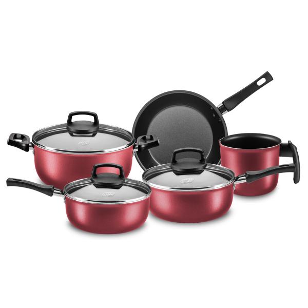 São 5 panelas de diferentes tamanhos de 1,2mm de espessura, tem um acabamento reforçado e revestimento de última geração proporcionando excelentes resultados na hora de cozinhar.