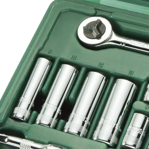 Jogo de soquetes sextavado fabricado em material resistente proporcionando durabilidade, com catraca e cabo fixo que serve como chave canhão, ambas trabalhando em conjunto com um soquete. Ideal para profissionais de qualquer segmento que utilizam ferramentas com necessidade de aperto e desaperto de parafusos e porcas sextavados, inclusive os de difícil acesso.