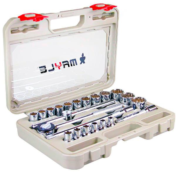 - 18 Soquetes estriados: 8mm 9mm 10mm 11mm 12mm 13mm 14mm 15mm 16mm 17mm 18mm 19mm 21mm 22mm 24mm 27mm 30mm 32mm